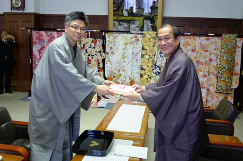 450年の歴史を有する京友禅の老舗「千總」。西村 總左衛門 会長、仲田 安司 社長から、見事な着物をご寄贈いただきました。