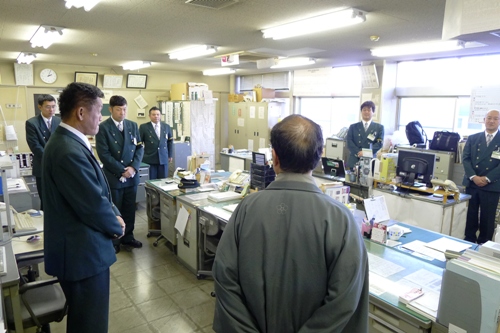 所長を先頭に職員がきびきびと働く姿。現場の第一線で職員が一丸となって、市民の皆さんのためにと頑張っていることを実感。作業に出発する職員一人一人に手を上げて激励しました。