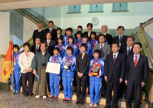 12日に開催された「皇后盃第32回全国都道府県対抗女子駅伝競走大会」において、見事に優勝された京都チームの選手、指導者の方々がご報告にとお越しくださり、橋村 芳和 市会議長をはじめとする市会議員や、多くの職員と共に拍手でお出迎えしました。