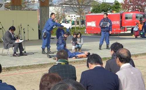 応急手当や煙の中を歩く体験コーナーなど消防団員の方々の手作りで、盛りだくさんの内容。会場は、子どもからお年寄りまで多くの方で多くの方で賑わいました。京都府出身の元プロレスラー小橋 建太さんのトークショーも大人気。「消防団充実強化実行チーム」はじめ、消防団の皆さんに感謝。