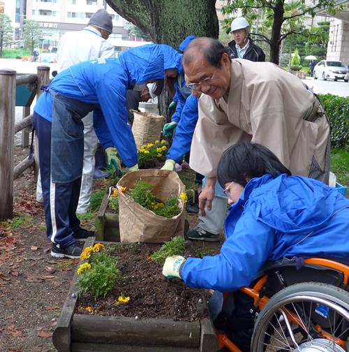 【東総合支援学校の6名の生徒さんが市役所前広場に植栽】