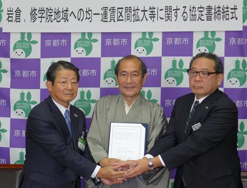 来年3月から、岩倉、修学院地域において市バスの均一運賃導入が決定!また、同地域で市バスに合せ、京都バスの運賃を変更。更に、4月から、京都バスでもICカードによる乗継割引サービスを全路線で実施いただきます。本日、市交通局、京都バスと協定書を締結。