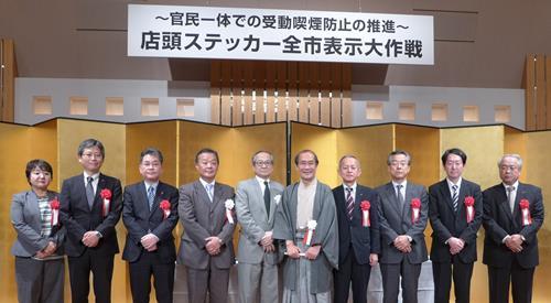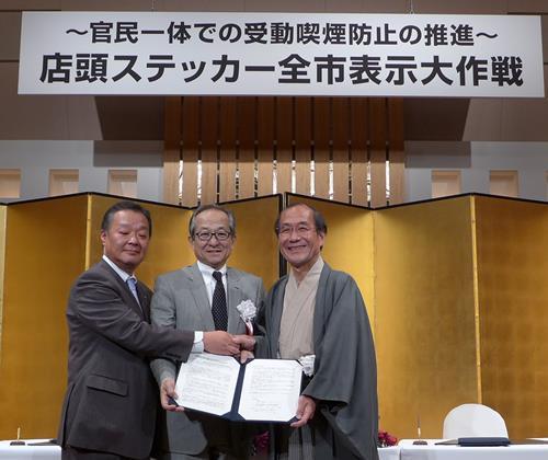 タバコを吸わない人と吸う人の共存(受動喫煙防止のため、飲食店、旅館等の入口に禁煙、分煙等を表示)に向け、北原 茂樹会長はじめ「受動喫煙防止憲章事業者連絡協議会」の皆さんと25年に協定を締結。