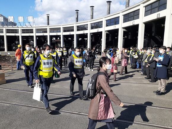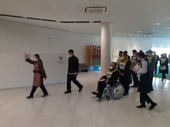 施設から緊急避難広場(梅小路京都西駅)への避難誘導、一時滞在施設の開設・受入などをWEB、LINEによる各事業所への情報伝達を行いながら緊張感を持って訓練。外国人観光客役として留学生の皆さんもご協力。実に実践的!