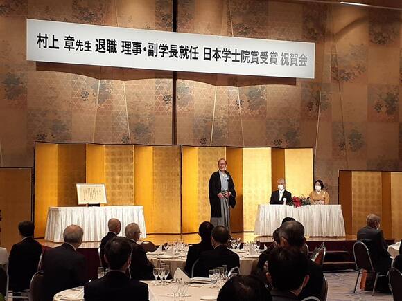 祝、京都大学 村上章先生、教授ご退職、理事・副学長ご就任、日本学士院賞ご受賞!祝賀会。長年にわたる研究や教育活動の成果が結実され、日本の学術賞としては最も権威のある賞「日本学士院賞」をご受賞(コロナ禍で延期されていたお祝いも併せてご開催)。世界に先駆け地盤変形の推定法を確立。崖崩れ・液状化の被害防止等に!また和牛の更なる魅力向上や、京大の和牛ブランド化にも多大なご尽力。本年8月には京大発の和牛ブランド「京大紅牛(くれなゐビーフ)」が京都市中央食肉市場に初上場!村上先生の偉大なご功績と多彩なご活躍に心から敬意。益々のご活躍を祈念!
